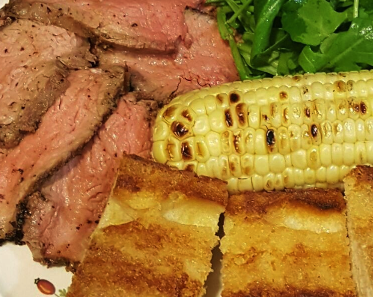 In this meal, the succulent beef is complemented by grilled sourdough garlic toast, sweet grilled corn, and a lemon-peppery arugula salad for a jolt of freshness and acidity. It pairs well with a strong California Cabernet or Zinfandel.