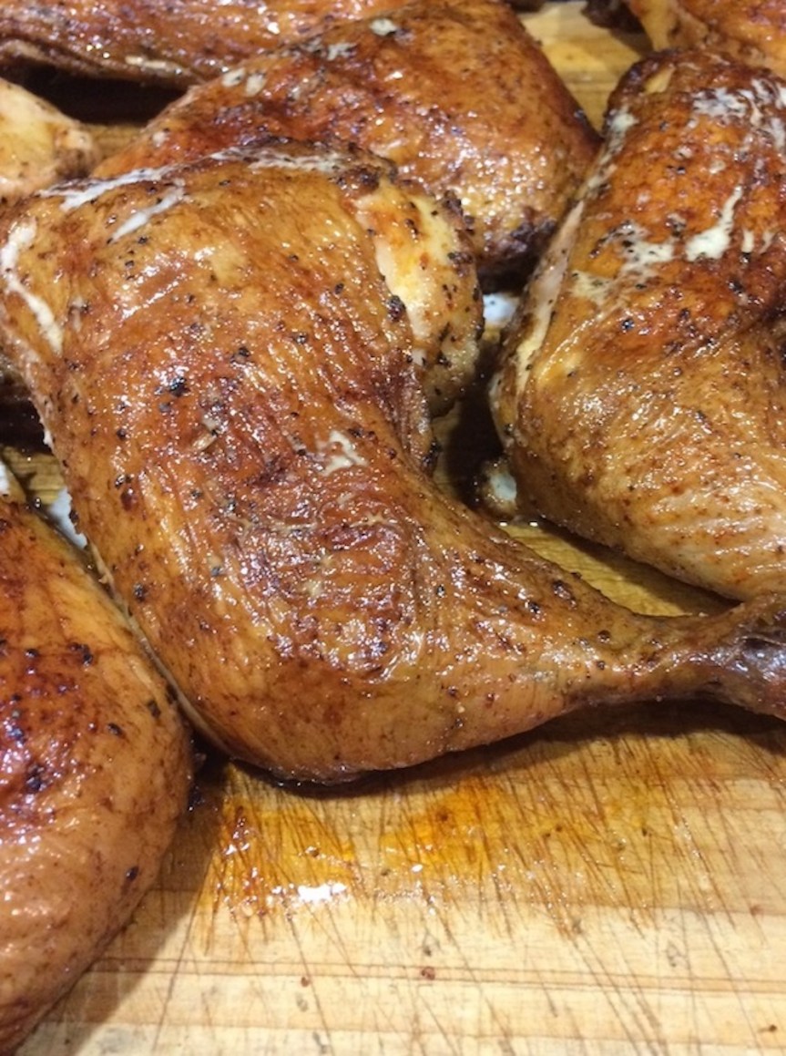 If you don’t have access to a grill, you can still make this delicious recipe in the kitchen (I’ve done it this way too, you just miss out a bit on the smokey flavor). Begin by preheating your oven to 300F. Fill a disposable aluminum tray with 1 inch water. Place a cooling rack on top of that. Place the chicken, skin side up, on the cooling rack and bake until chicken’s internal temp is about 160F. When it hits the 160F mark, flip it over and plonk something heavy on top and return it to the oven for about 10 minutes. During this time, heat a cast iron skillet or copper pan to very hot, over high heat. After the ten minutes skin-side down in the oven, transfer the chicken to the skillet and brown for about 2-3 minutes, skin side down, and set aside. Work in batches if necessary; don’t overcrowd the chicken quarters in the skillet.