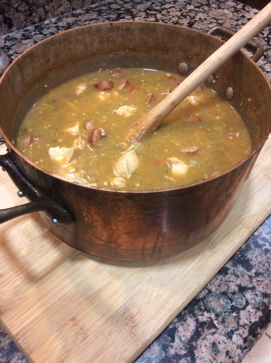 Note: Adding the hot roux directly into the simmering pot will create an impressive explosion, sending lava-hot roux and boiling broth erupting like Vesuvius all over you and your kitchen. I did this on the first go-round; don’t be like me. Follow the instructions in the next paragraph instead…