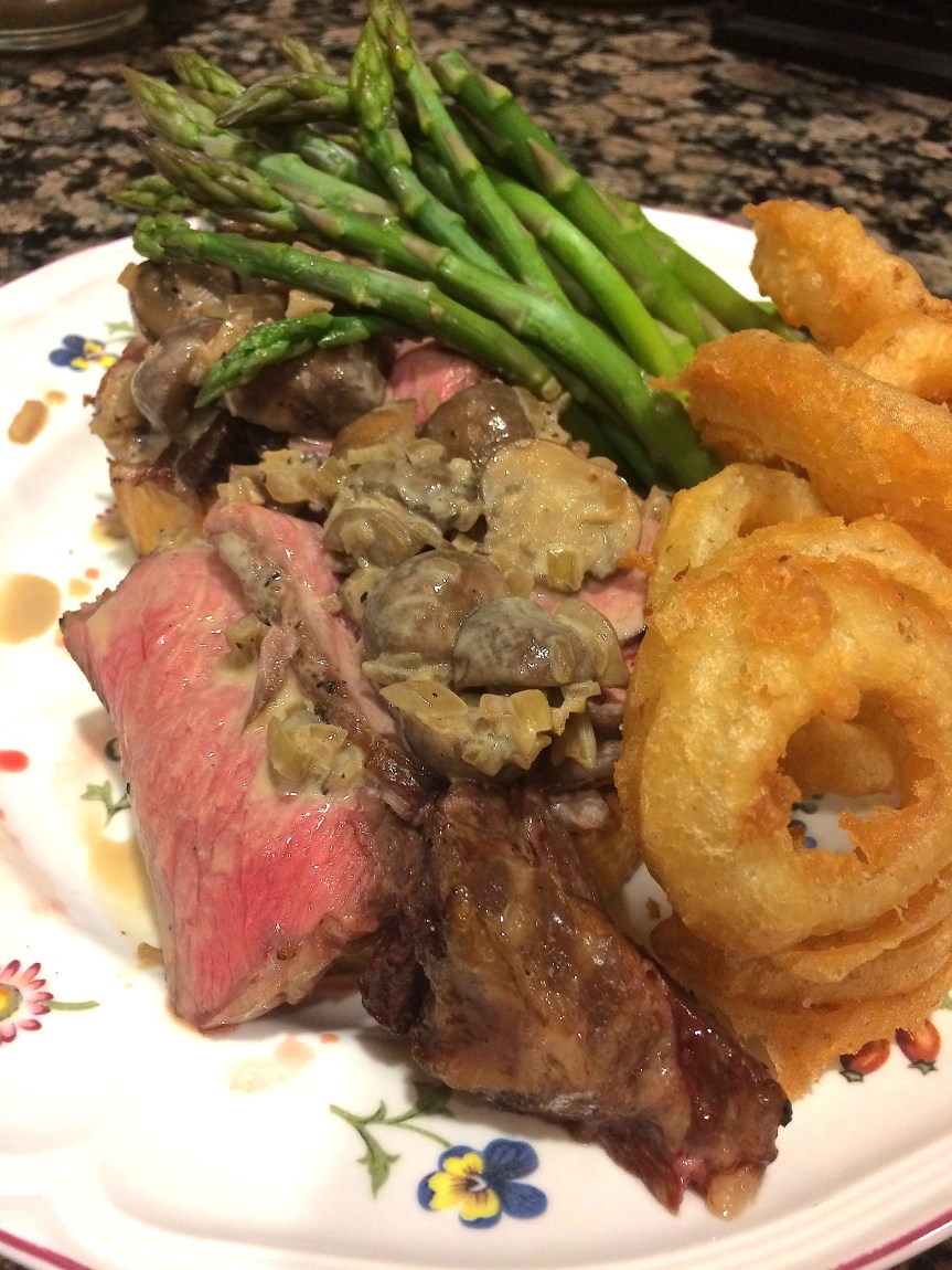 Serve with onion rings, steamed asparagus (or any other green vegetable) and a robust red wine.
