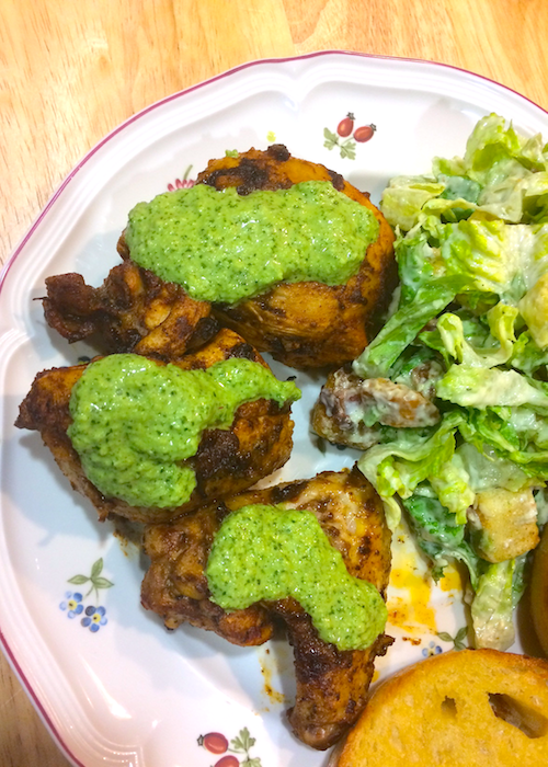 This delicious, succulent chicken served with a green sauce similar to a creamy chimichurri is a sure crowd pleaser. This version is a loose adaptation of J. Kenji Lopez-Alt’s grilled recipe featured on his blog Serious Eats. While it could also work out quite nicely on the grill, this version is executed in the kitchen and is one of the best things I’ve made in a long time.