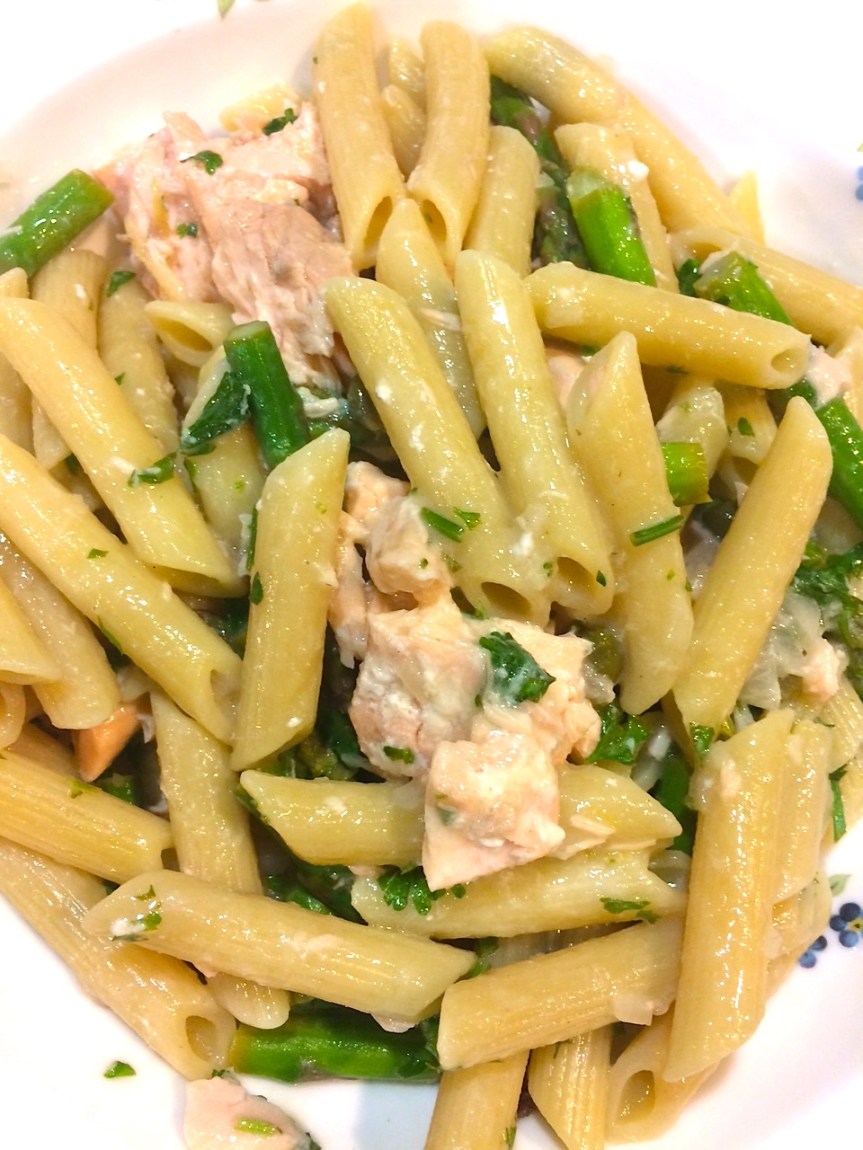- Slice salmon filets into small, bite-sized pieces and add to the pan with the sauce, asparagus and penne.