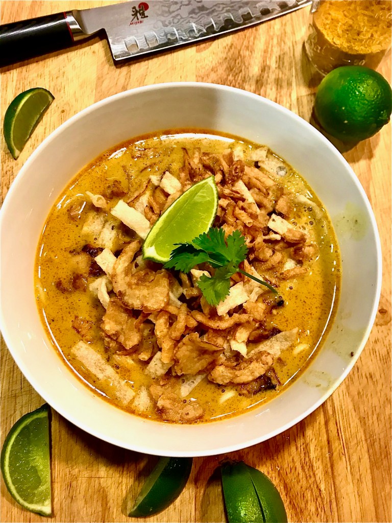 I first had this version of curry in Bend, Oregon of all places. I was on a business trip, and one of my coworkers recommended a local Thai place for dinner. I was a bit skeptical, but as it turns out, Bend, OR has all kinds of great food. I’d never had anything quite like this before, so when I got home I immediately set my sites on figuring out how to make this wonderful dish. It looks complicated, but once you realize that, basically, it’s soup with a lot of unusual ingredients, it’s really isn’t all that hard at all.