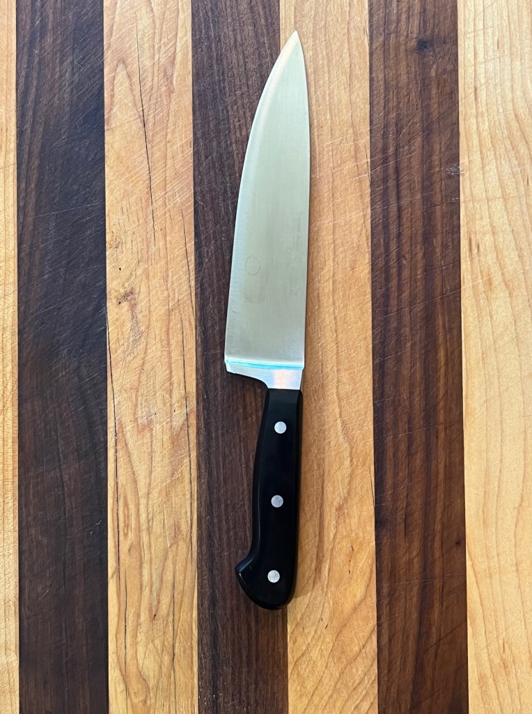 Don’t freak out: A good chef knife is going to cost you somewhere between $100 – $200. If you’re serious about cooking, it’s a worthwhile investment because it will last you 10 years or more, will improve the speed and efficiency of your prep, and will actually make your food taste better because you will be able to more easily make things the same size, ensuring even cooking.