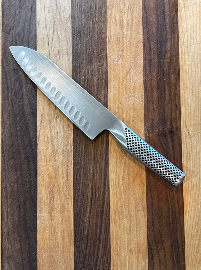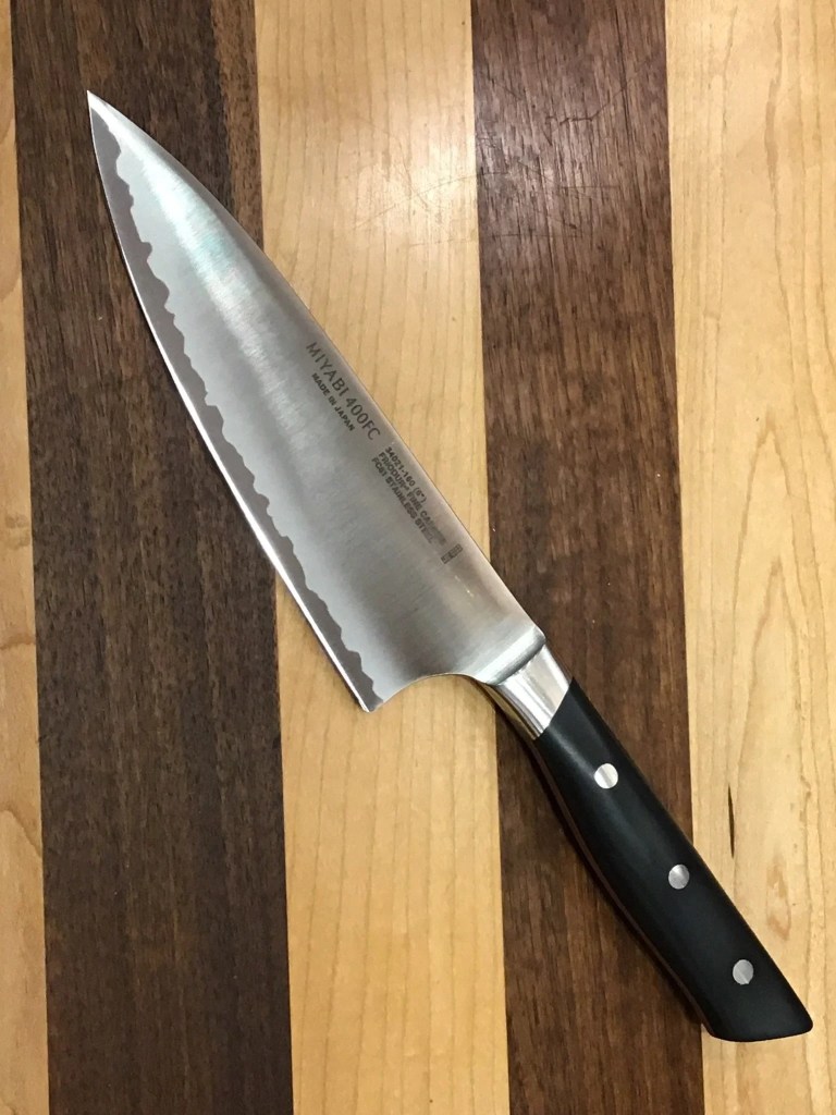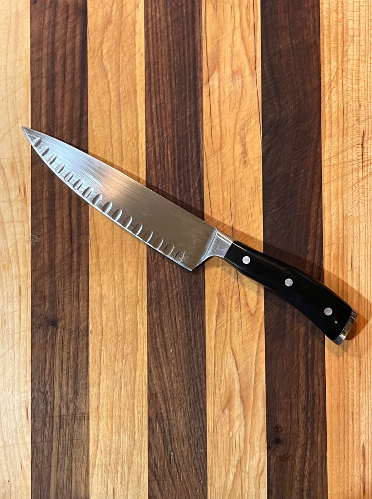 Note: Some knives have what is known as a granton edge. These are the knives that have small ovals on the side of the blade. The idea is to help keep food from sticking. I’ve never noticed an appreciable difference, but the first knife I ever owned was an 8-inch Wusthof Classic Ikon (58 on the Rockwell Scale) with a granton edge. Eventually, it will wear down to the ovals – the knife will still be usable.