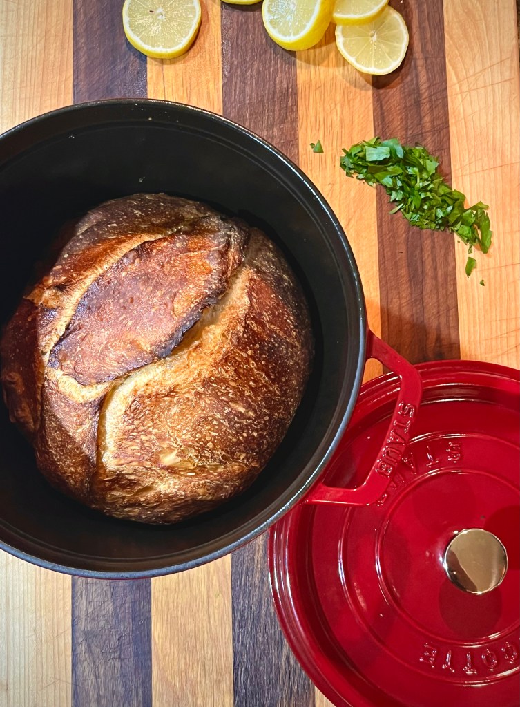 10. After 30 minutes, carefully remove loaf from dutch oven and return to the center rack. Allow to bake directly on the wire rack for another 15 minutes. (If you have a convection setting and like your bread super crispy, you can set it for convection in the last 4 minutes).