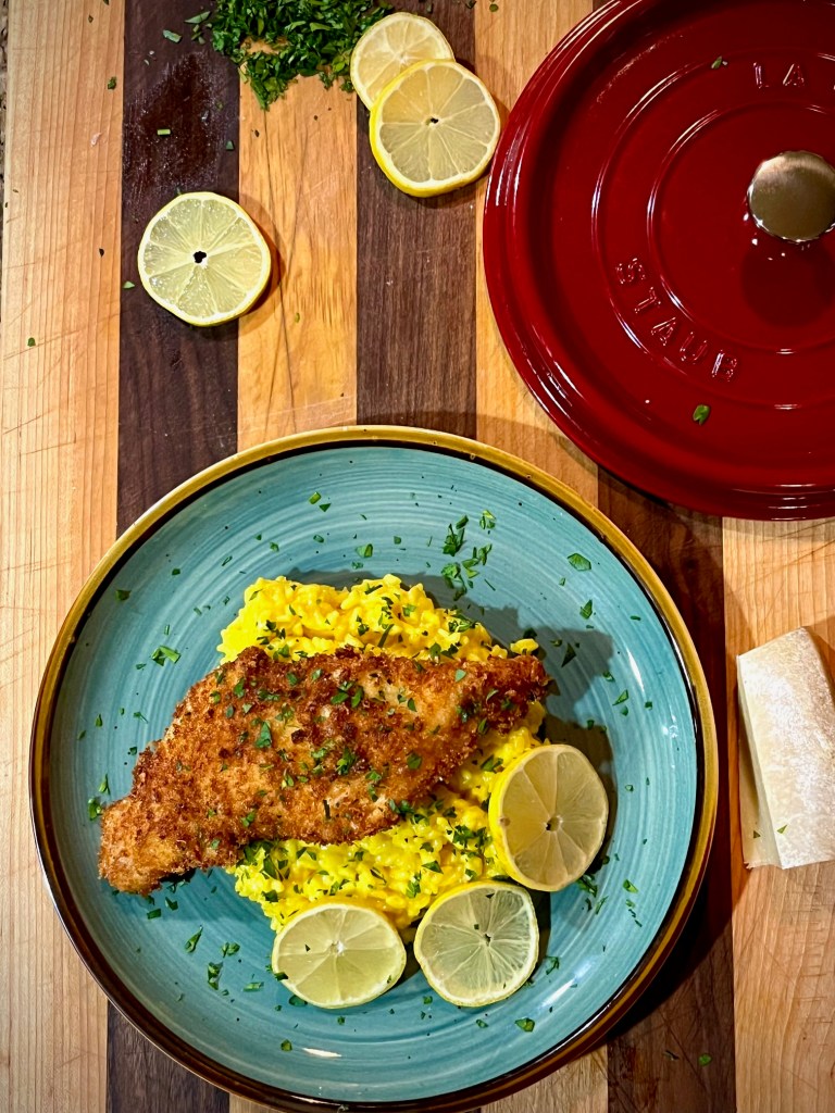 This recipe, which hails from Milan, Italy contains a couple of great secrets that will serve you well in other recipes too, namely (1) How to nail the perfect chicken cutlet, and (2) How to make a perfect risotto without having to stir it for an hour.