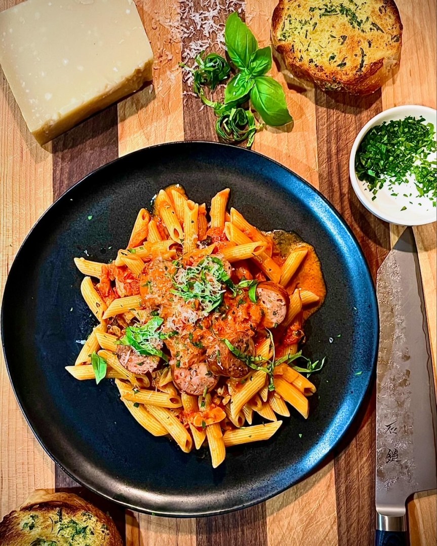 - 1 lb penne rigate, cooked 2 minutes shy of package directions (it will finish in the sauce)